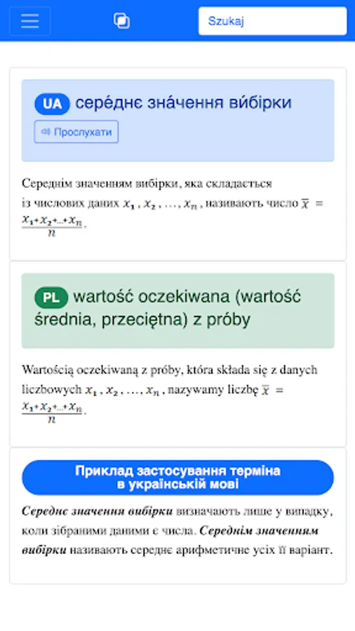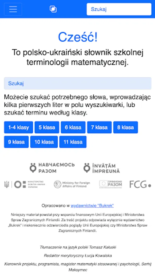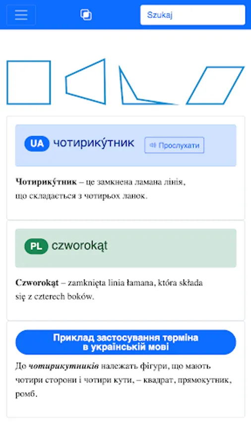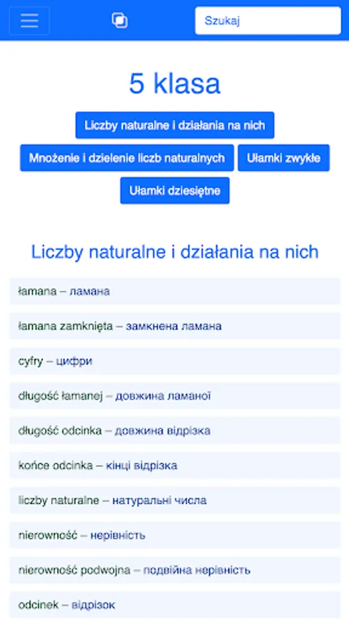 You can search for terms in both Polish and Ukrainian in the dictionary. It can be used individually during homework and as additional material in math lessons.