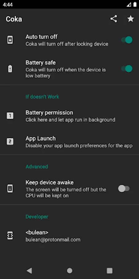 Coka is a simple application that allows you to keep the screen on, while other applications are running in the foreground.