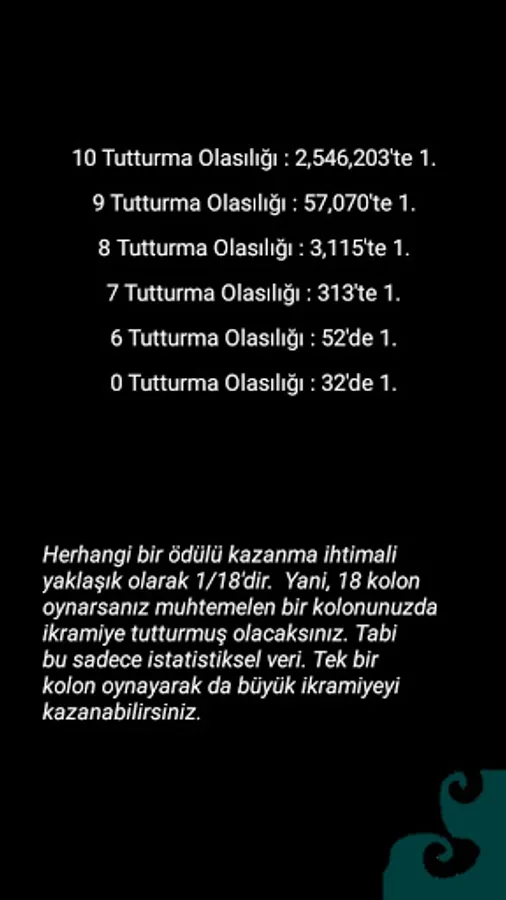 When you play the numbers seen on the screen, you distribute all 22 numbers to be drawn into only 8 columns. By playing only 8 columns, you start the game with the guarantee of knowing at least two 3s, possibly 4 points. You start the game much further and with a much greater chance than the random or machine-played columns. You will most likely start the game with 4 or 5... The more columns you make, the higher your chance of winning. GOOD LUCK......
