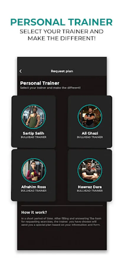 ⁃ دەتوانی یەکێک لە پاکێجەکانی ڕاهێنەرکانی بوڵهێد هەڵبژێری بە پێی ئامانجی خۆت، پاش داواکردنی، لە ڕێگەی ئەپڵیکەیشنەکەوە، ڕاهێنەری هەڵبژێردراو پڕۆگرامێکی تایبەت بە خۆو بۆ ئامادە دەکات.