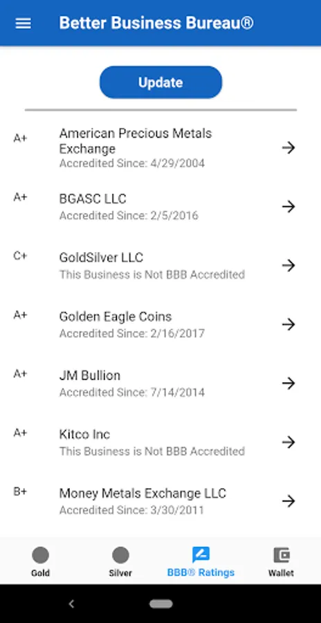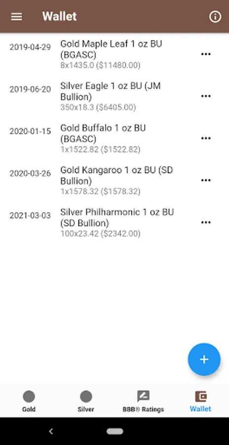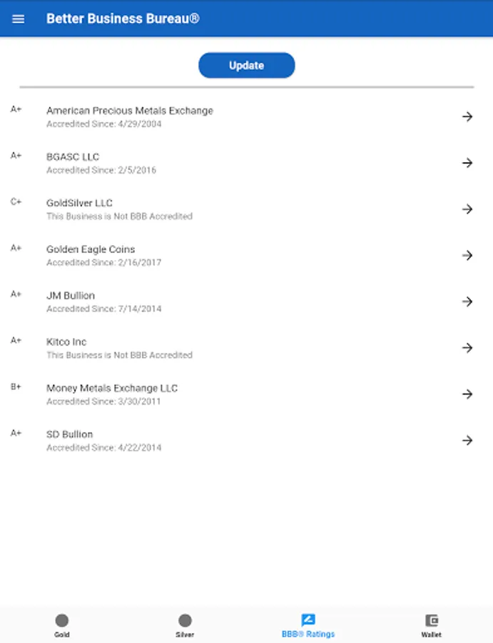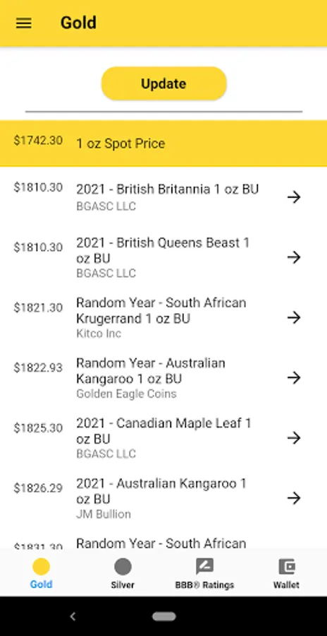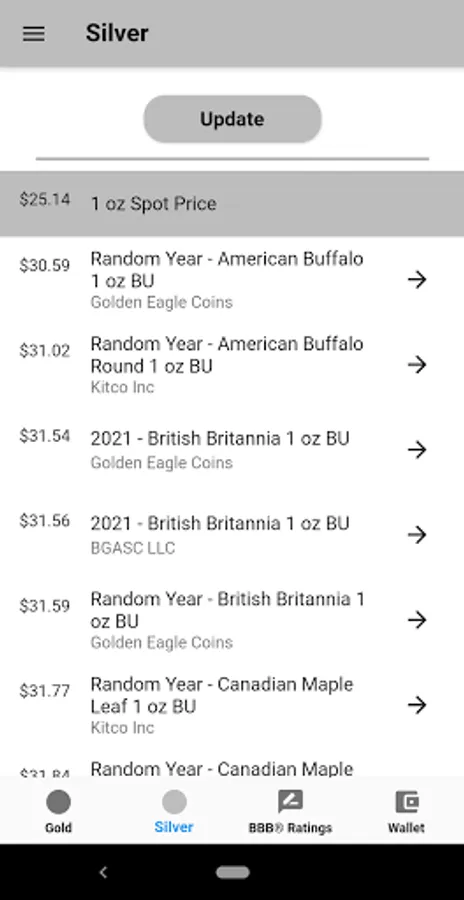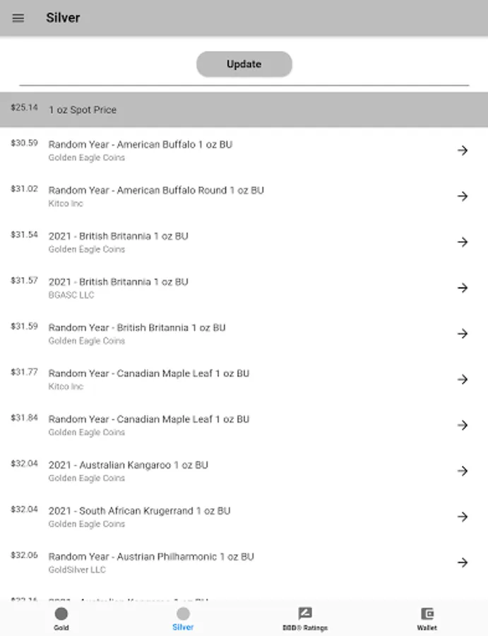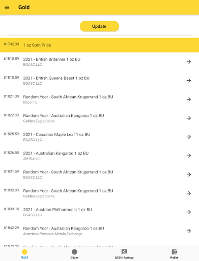 Bullionaire is a data mining application that will help you find the most reasonably priced metals being sold online. The app scans a catalog of websites and delivers a consolidated list of their posted prices. When you decide on your purchase, the app links you to the online dealer to complete your order.