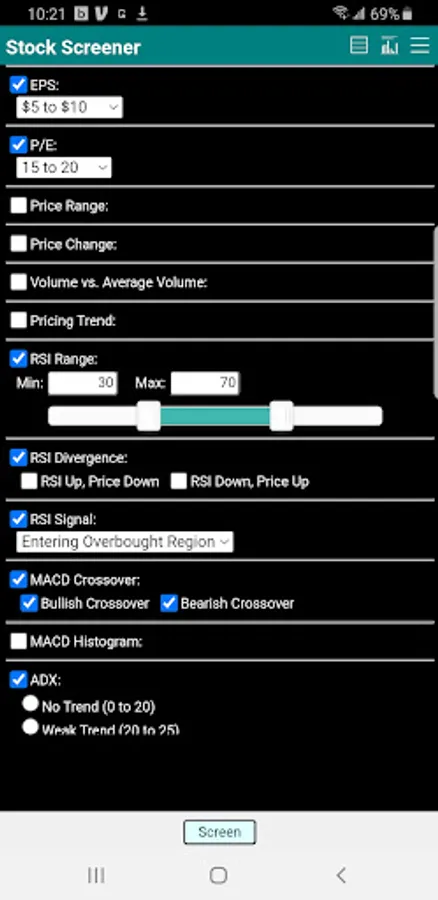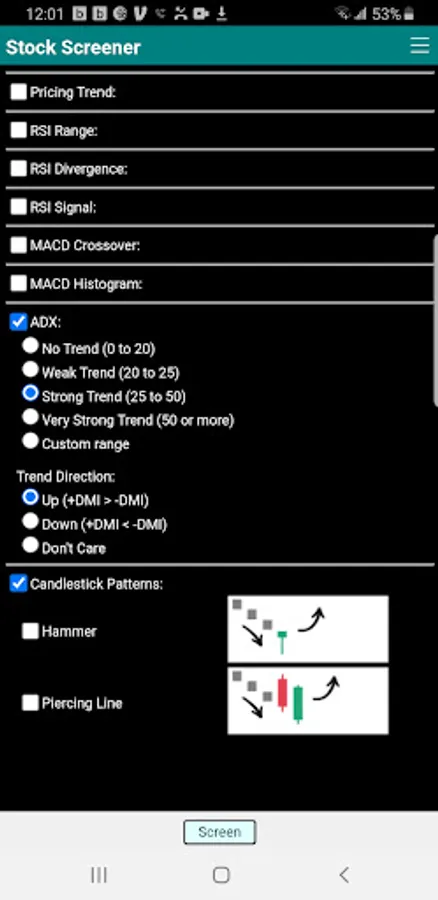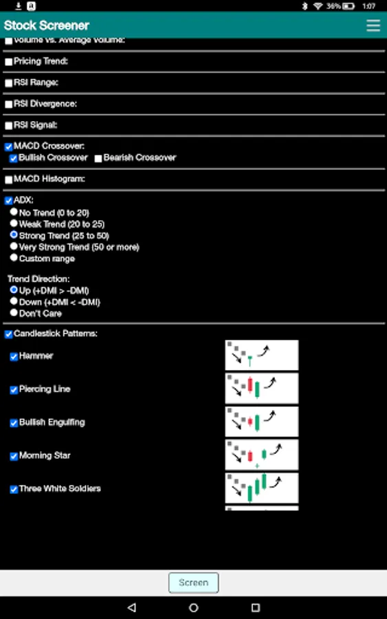 Technical screening criteria include pricing trend, moving average stack up, RSI range, RSI divergences detection, RSI overbought and oversold signals, MACD crossover detection, MACD Histogram signals, ADX strength and ADX trend direction.
