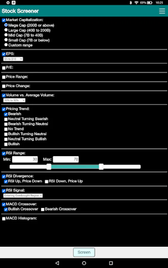 The Stock Market Screener App finds securities with unique trading opportunities based on key fundamental and technical characteristics as well as chart patterns.