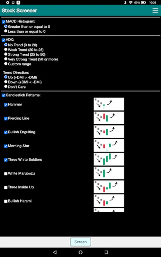 .Technical screening criteria: pricing trend, price change, moving average stack, volume, RSI range, RSI divergence, RSI signals, MACD signals, MACD numbers, ADX trend and values.