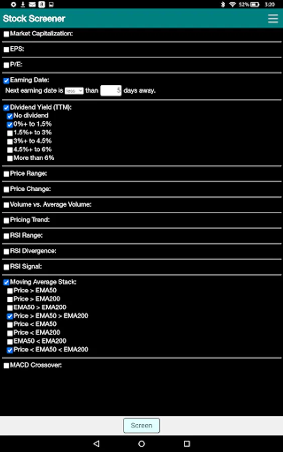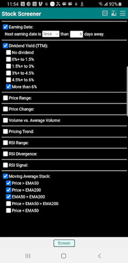 Version 1.1 includes screening by dividend yield, earning report date and moving average stack.