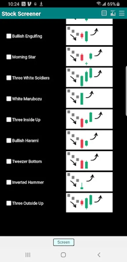 .Chart screening criteria: 31 Candlestick patterns.