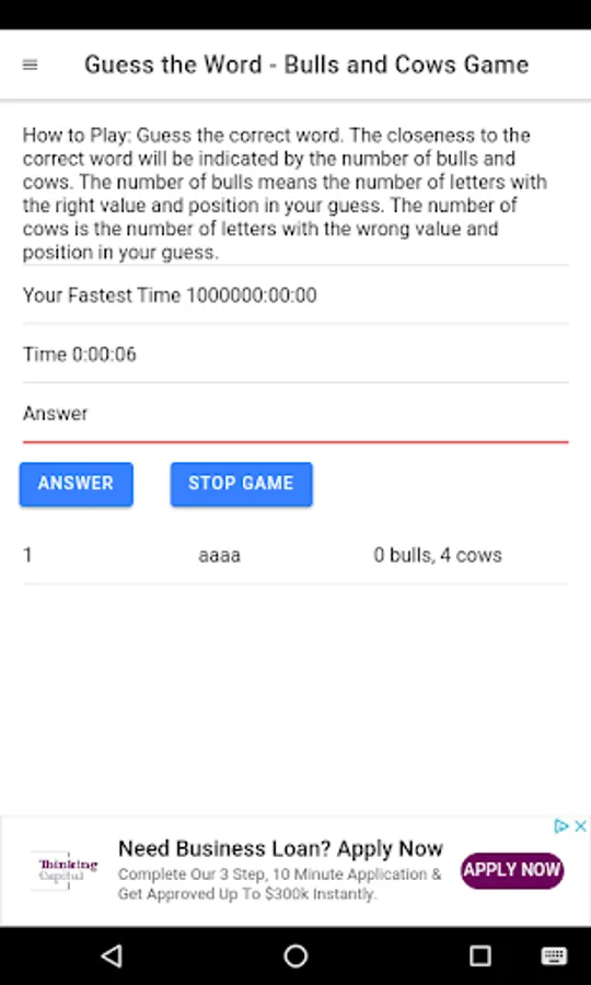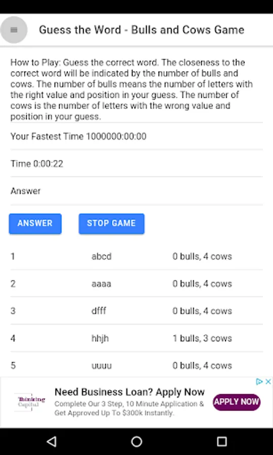 How to Play: Guess the correct word. The closeness to the correct word will be indicated by the number of bulls and cows. The number of bulls means the number of letters with the right value and position in your guess. The number of cows is the number of letters with the wrong value and position in your guess.