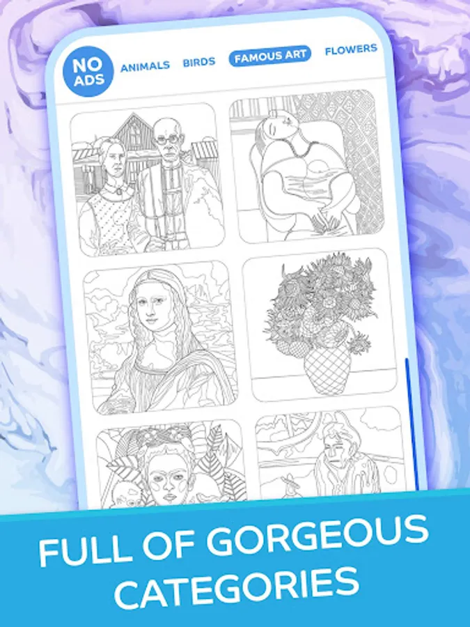 Choose any category you like to color (Famous arts, Landscapes, Birds, Flowers and others)