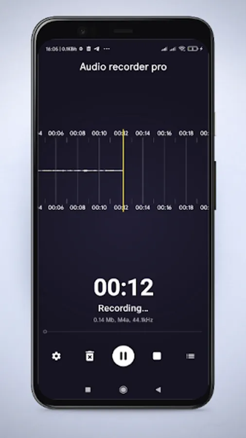 Audio Recorder Pro is an audio recording and playback app that offers two recording formats: M4A and Waveform Audio File Format (WAVE , or WAV). In settings, you can set the sample rate and bitrate (for AAC only), as well as select between mono and stereo. These preferences directly affect the file size of the recordings.