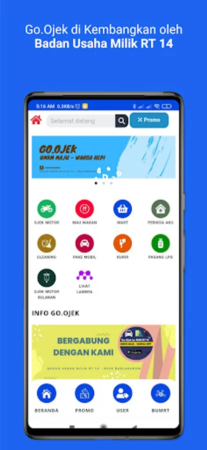 Go.Ojek by BUM RT14 di kelola oleh IT Badan Usaha Milik RT 14. Aplikasi ini memungkinkan Warga Desa Banjararum pada umumnya dan Perum Banjararum Asri, Estate dan View RW XI serta sekitarnya untuk memanfaatkan aplikasi ini. Berbagai fasilitas seperti Ojek Motor, Kurir Cepat, Bersih Rumah, Cek Kesehatan di rumah, Antar LPG, Ojek Motor Bulanan, Toko, Belikan Makan, dan lain lain. Aplikasi ini dibangun untuk pemberdayaan UMKM yang berada di Desa Banjararum