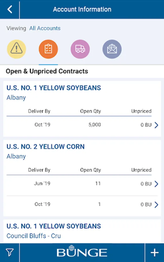- Access your Bunge account information to see your open contracts, recent shipments and recent payments.