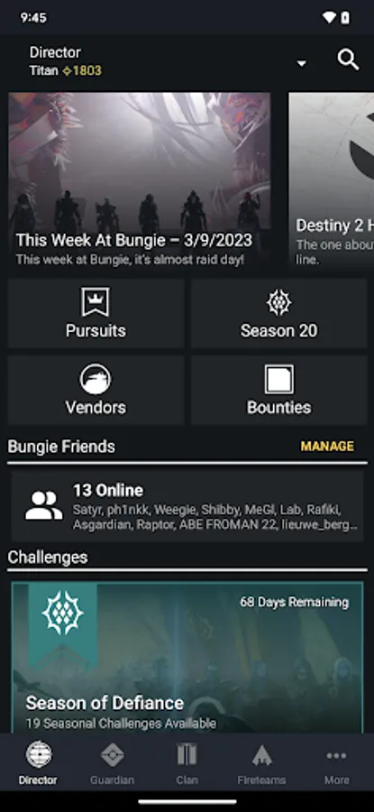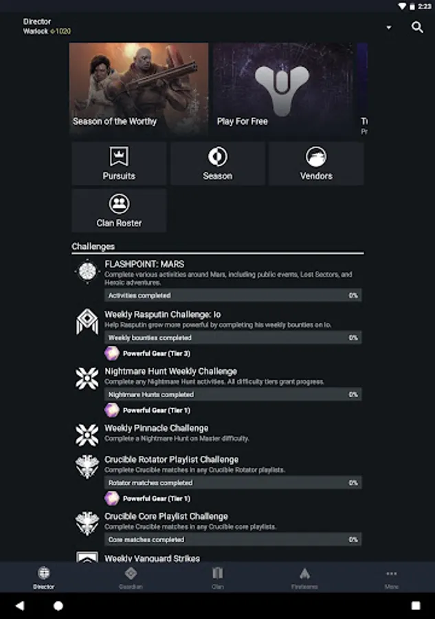 DIRECTOR - See the latest featured content. Track your progress towards bounties, quests, and challenges. Discover what events and activities are live in the game. See your current rank for seasonal rewards, acquire bounties, claim rewards from the previous season, and inspect vendors for what they have available.