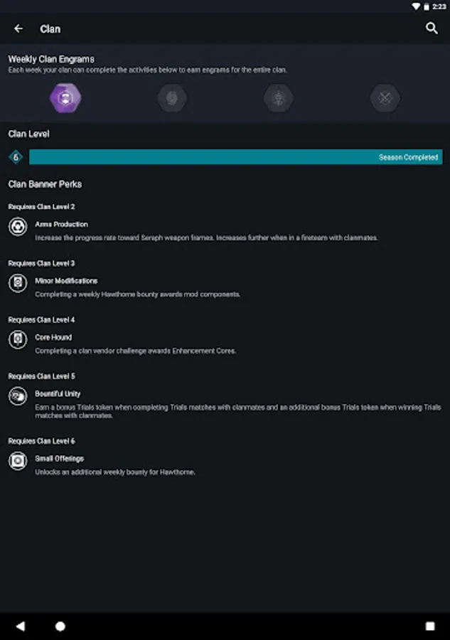 CLAN - Create and manage your Clan with its own unique shared identity - or browse for an existing clan to join. Track your clan level, progress, and all shared rewards. Stay connected with your clanmates through text chat on one or more clan specific channels.
