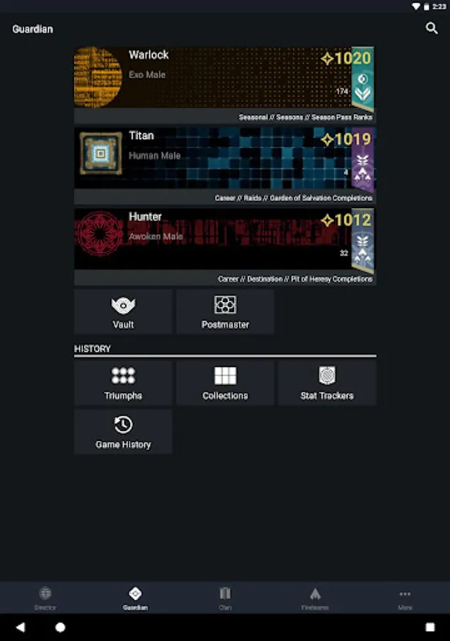GUARDIAN - Inspect all of your favorite weapons and armor, view item stats and perks, and move your equipment between your characters and the vault. Retrieve lost items from the Postmaster without heading to the Tower! View your Triumphs, Collections, Stat Trackers, and Game History.