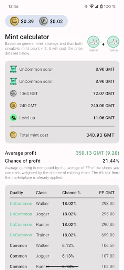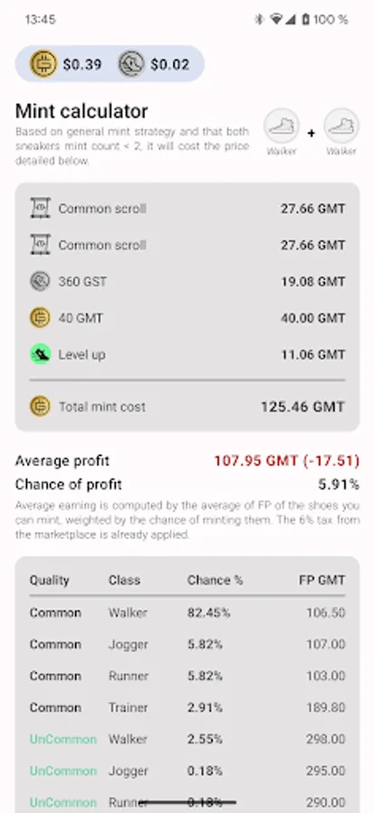 The app also displays the average earning potential based on the floor price of the sneakers on the official marketplace and the weighed mint chances. This information helps users determine whether a particular pair of sneakers is worth the investment/mint in terms of potential profit.