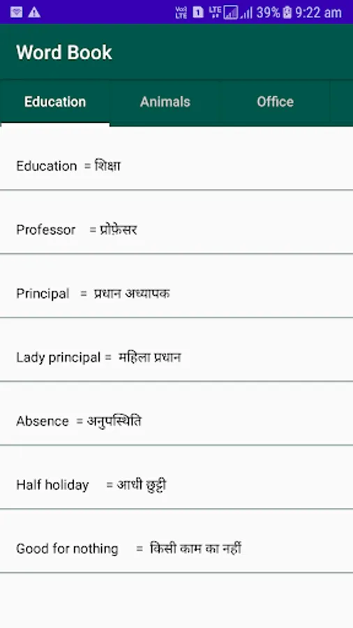 This app is also provide to you many Category of words like-Education, Animal, Office, Relatives, Human Body, state of life, fruits, flowers, Vegetable, foods, Spice, House, Political, caste, Business, Society and tradition, Sports, Fight, diseases, time & day, Rashifal, mines, cinema, feelings, books and math in this Hindi English dictionary,English Hindi Dictionary,Hindi English Wordbook