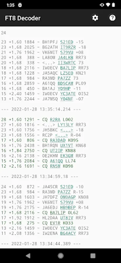Use the ClockSync app (version 1.2.6 by Sergey Baranov) to verify the time on your Android phone. Getting the time correct on your phone is CRITICAL. Without correct time on your phone, the app will NOT be able to decode FT8 traffic.