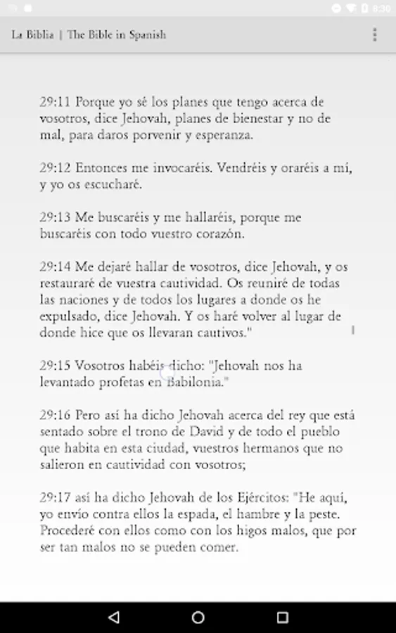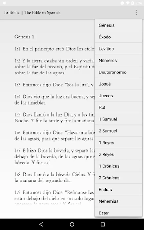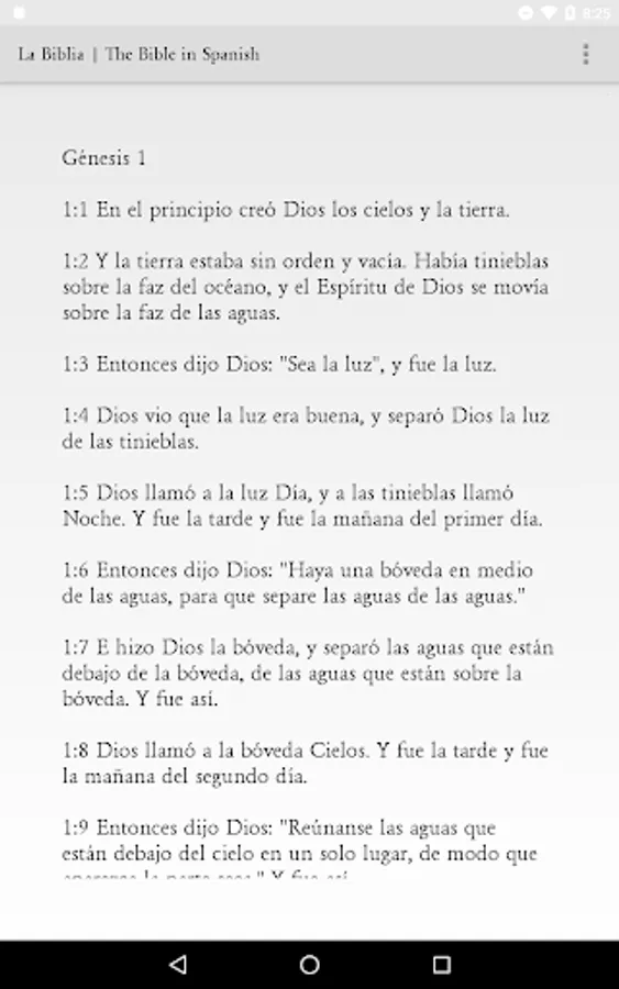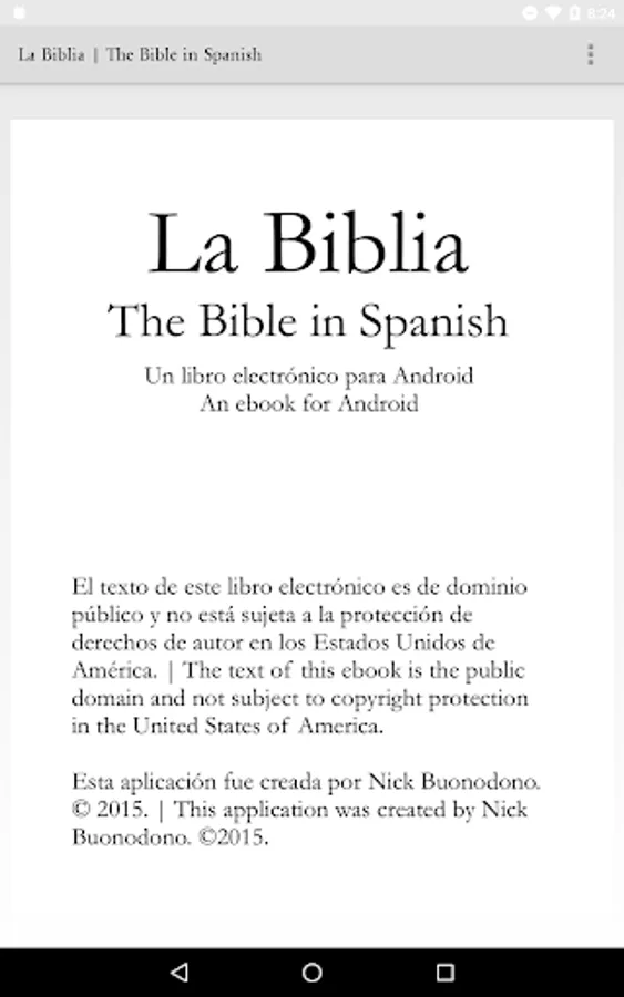 An ebook of the Bible in Spanish. Simple. Beautiful. Easy to read. Easy to use. Swipe left or use the menu to switch books with the Bible. No Android device permissions required.