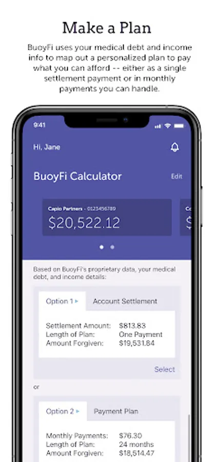 Through BuoyFi, you can calculate what you can afford to pay (based on your total income and amount of medical debt) and receive recommendations on settlement options you can take to your healthcare provider, billing service, or collections agency. BuoyFi is secure, easy to use, and is the only app designed by medical debt and patient financing experts solely focused to help people resolve burdensome medical debt.