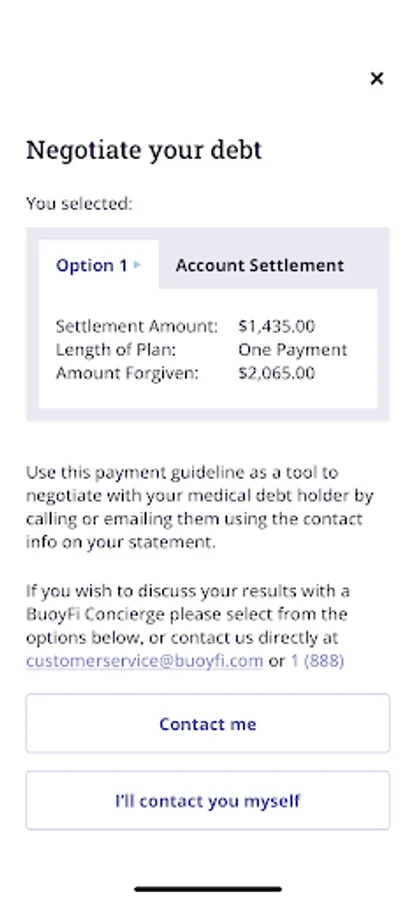 · BuoyFi calculates what you can afford to pay based on your income-to-debt ratio and suggests a one-time resolution amount or a manageable payment plan.