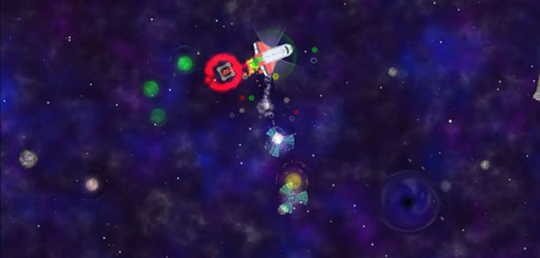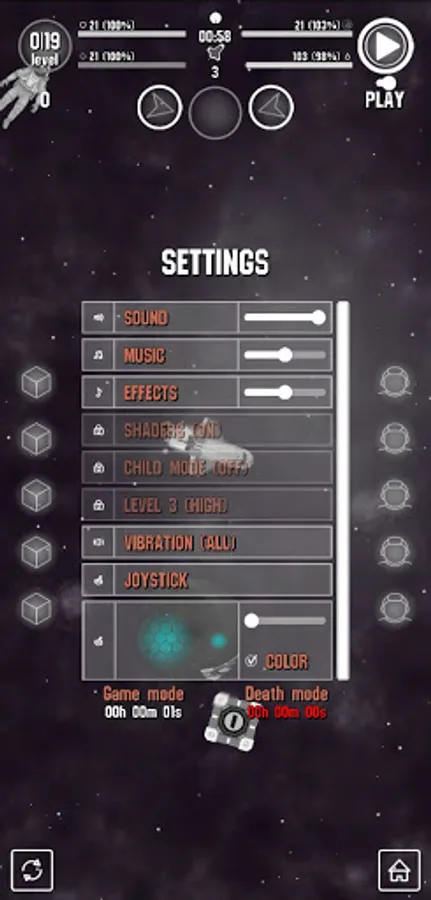Space mechanics, inertia, teleportation, parallax, absorption of matter. You can configure the control mode: using a touchscreen or a joystick. The joystick appears when you press anywhere on the screen. Multi-touch is also supported.