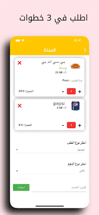 - اطلب وجبتك في ٣ خطوات بسيطة واحصل على وجبتك طازجة في مكتب أو بيتك