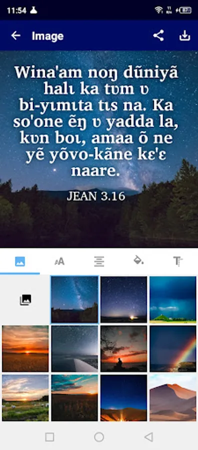 • When you tap on a verse, an image button is displayed on the bottom toolbar. When this button is pressed, the screen appears. You can choose the background image, move the text around the image, change the font, text size, alignment, format and color. the final image can be saved on the device and shared with others.