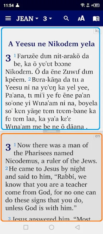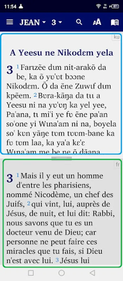 - "verse by verse" to display a verse in Kusaal followed by the same verse in French or in English.