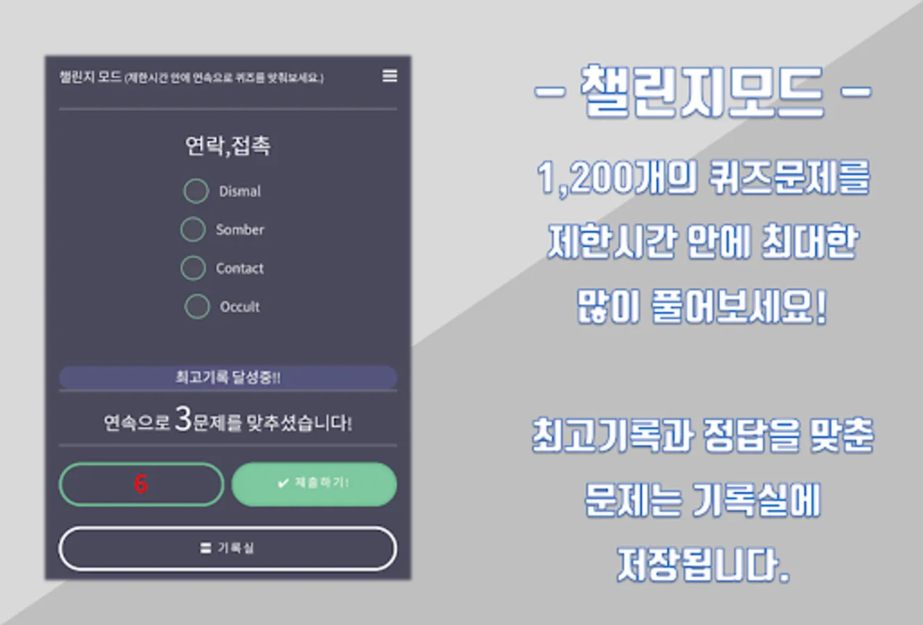 Challenge Mode-Try to get as many quizzes as possible within the time limit.
