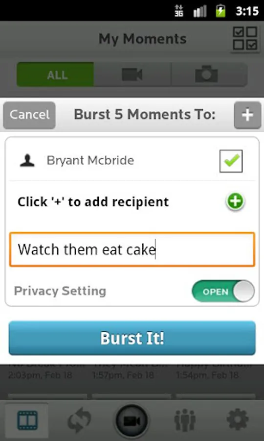 The Burst App provides you with the tools and features to enable easy capture, simple editing, and group video sharing in a “Bubble” where multiple contributors can all add media into one common album.