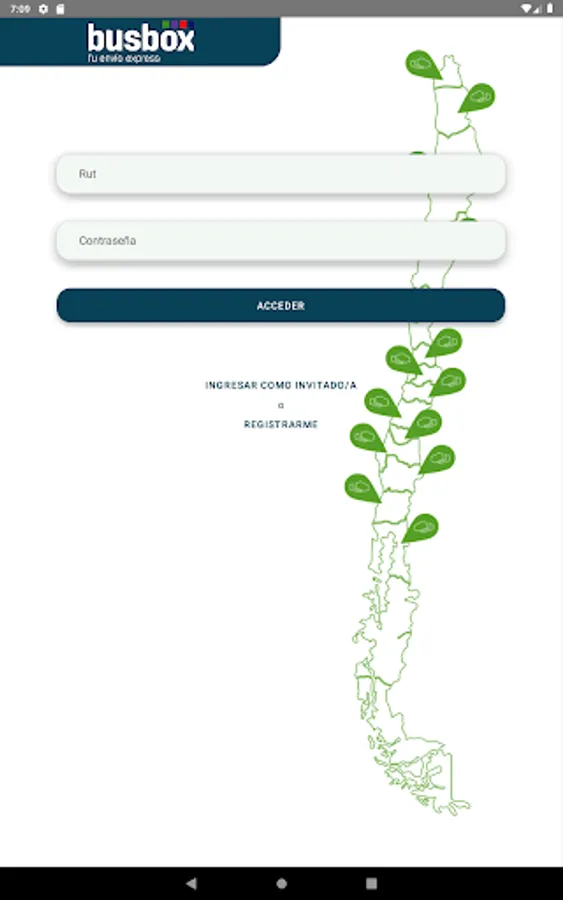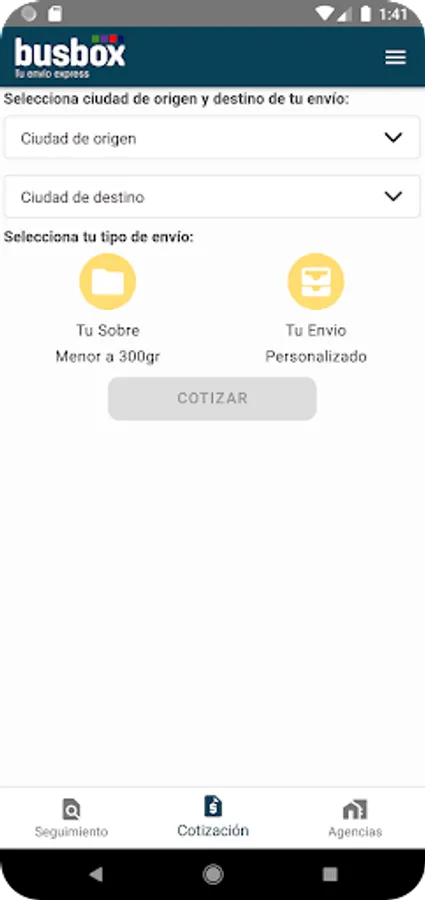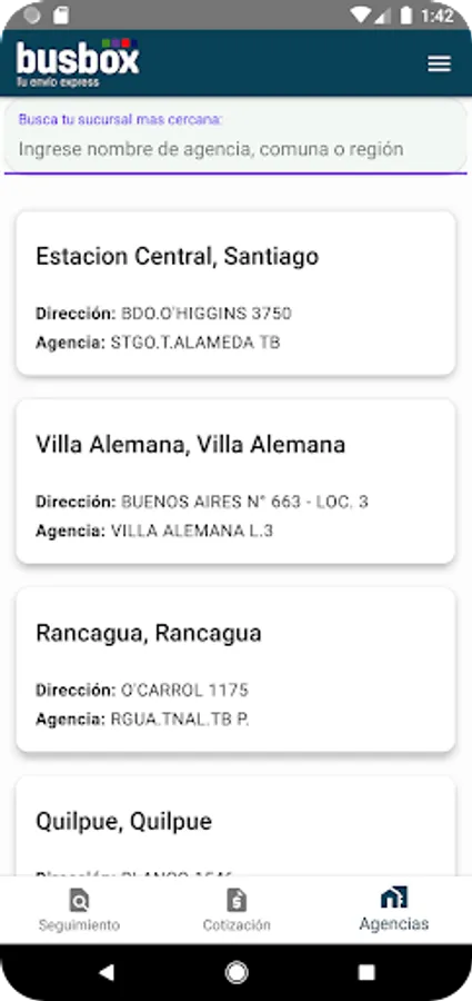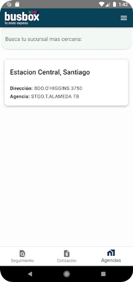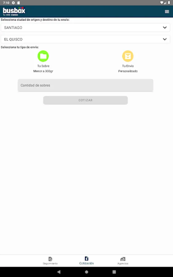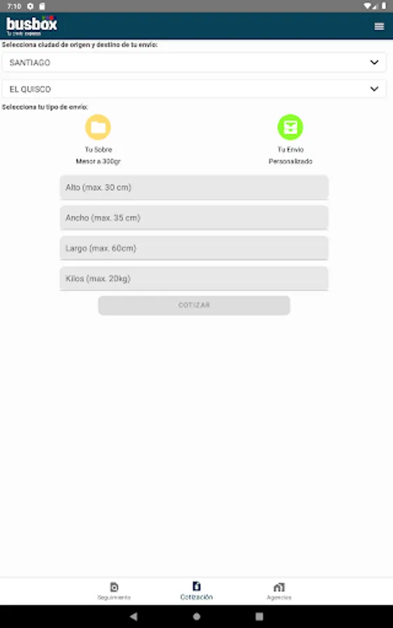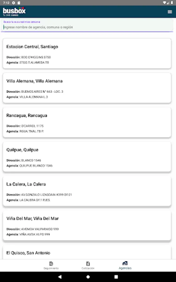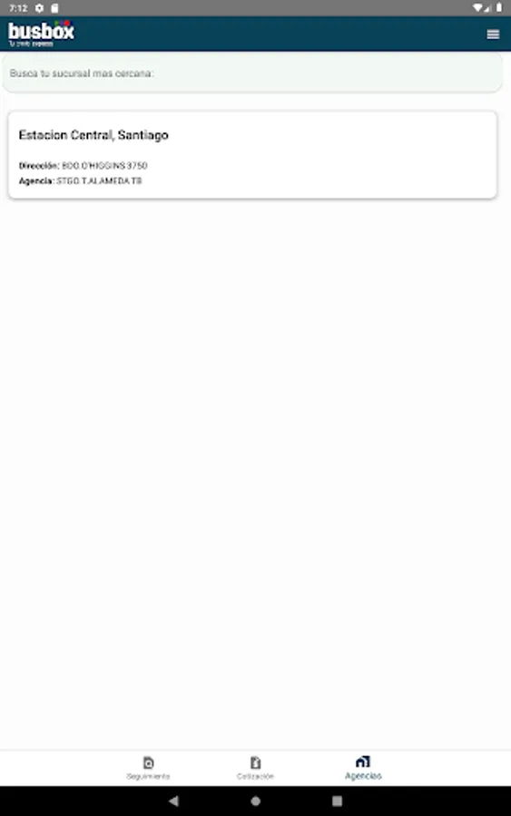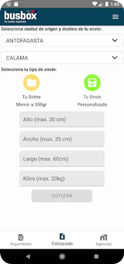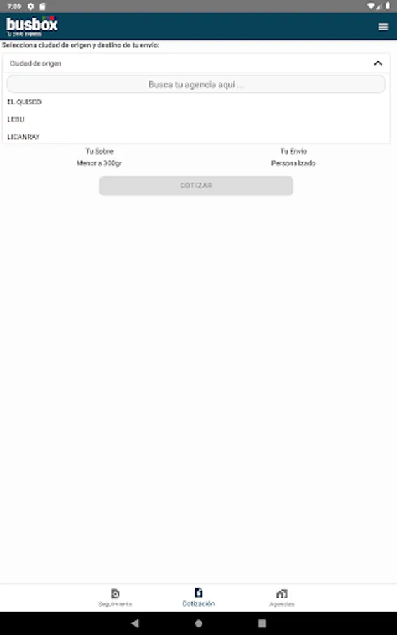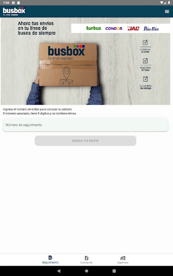Application for tracking parcels, quoting routes and a list of Busbox agencies.