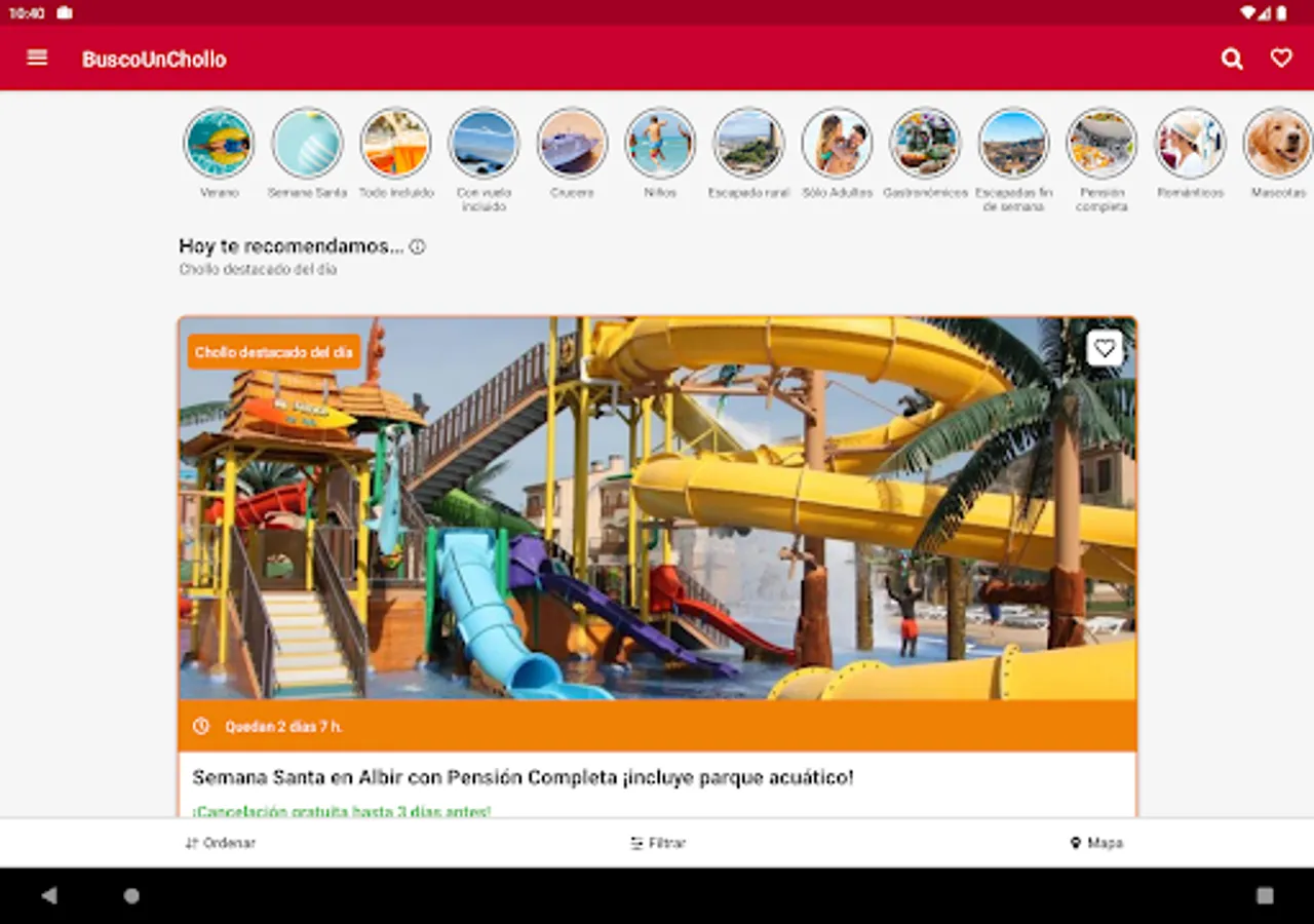 ● BuscoUnChollo - Travel, Hotel and Vacation Offers is a "flash" Travel App, so our BARGAINS on trips, getaways, hotels and vacations are available for LIMITED TIME (between 5 and 10 days) . Remember, here we DO NOT make you dizzy with offers, only DEALS! Don't miss the opportunity to reserve the DEAL you like before it expires or is sold out!
