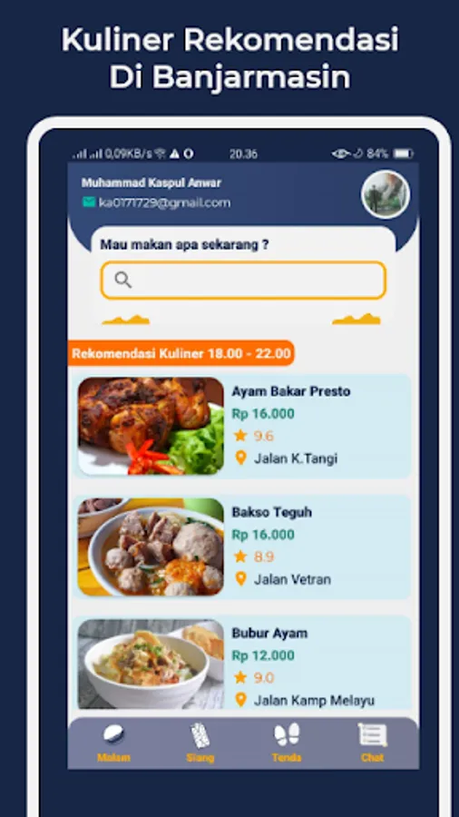 This app provides a feature of finding food in the Banjarmasin area with 5-star recommendations and not only that, you can also book a tent for camping