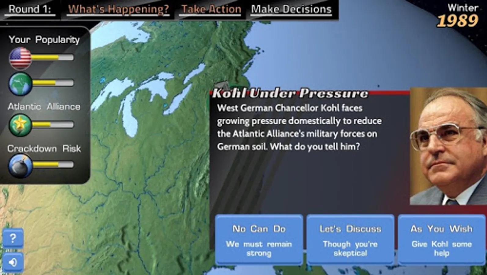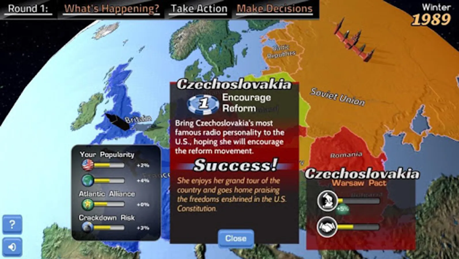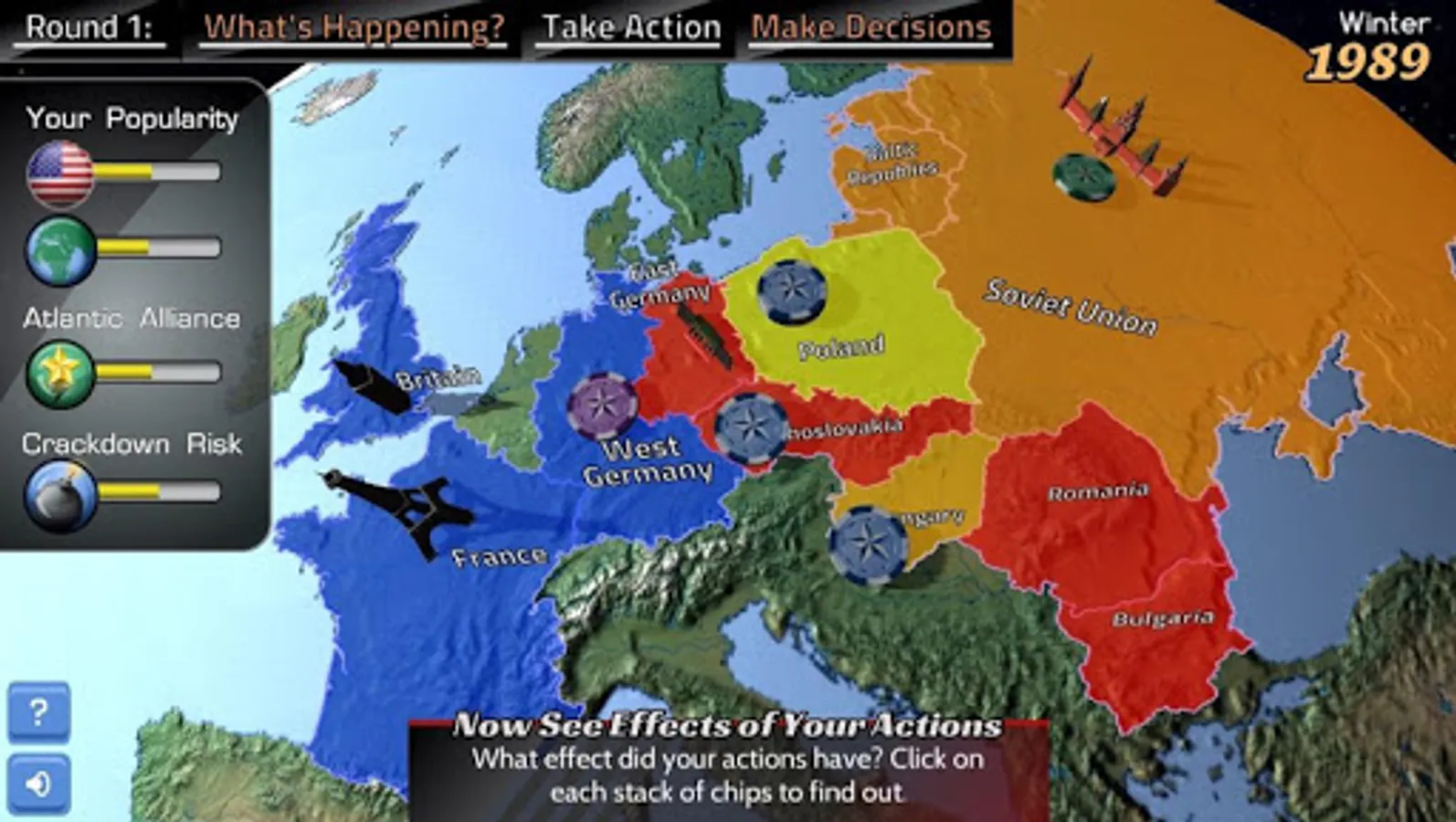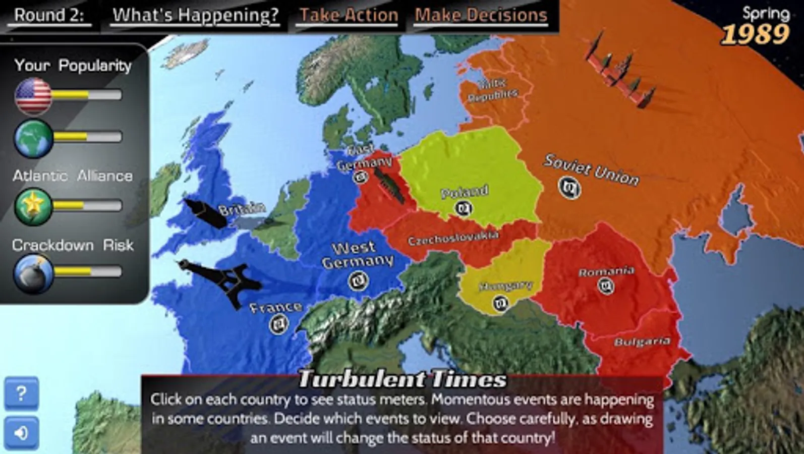 The year is 1989. You are President of the United States in transforming times. After forty years of oppression, the people of Eastern Europe are daring to defy their Communist overlords at home and in the Soviet Union. And as President, you too face daring decisions: how far will you go to encourage democratic reform? How much will you risk a Soviet crackdown on these freedom-seeking peoples? Will your efforts help bring democracy to Eastern Europe, or will you provoke the Soviet Union to bring down its wrath, setting the cause of freedom back by decades?