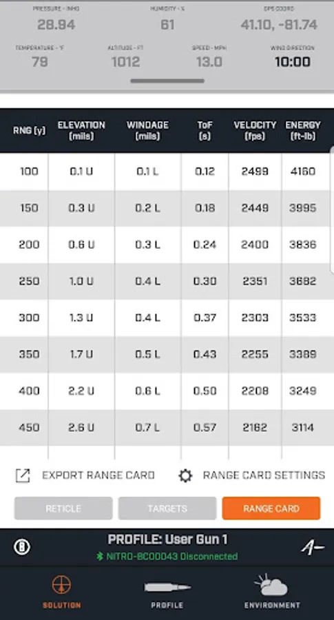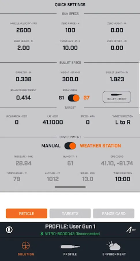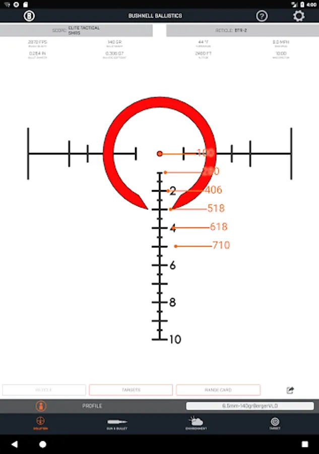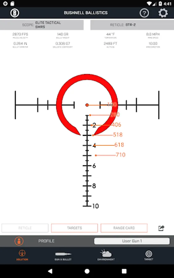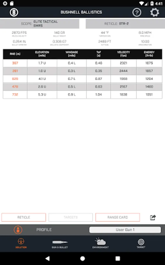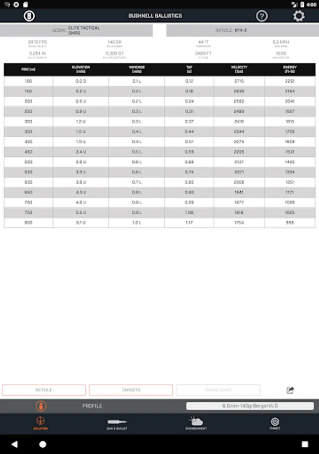 Welcome to the new Bushnell® Ballistics Application powered by Applied Ballistics®. It is a full-featured ballistics solver to use with your Bushnell rangefinders and riflescopes to calculate firing solutions. It allows you to use current atmospherics to calculate the holds and display the ranges at each subtension on your reticle. With this application, you can build and modify gun profiles, create a custom target, show a range card and calculate firing solutions based on your exact scope and ammunition. Additionally, range cards may be emailed to yourself or a friend.