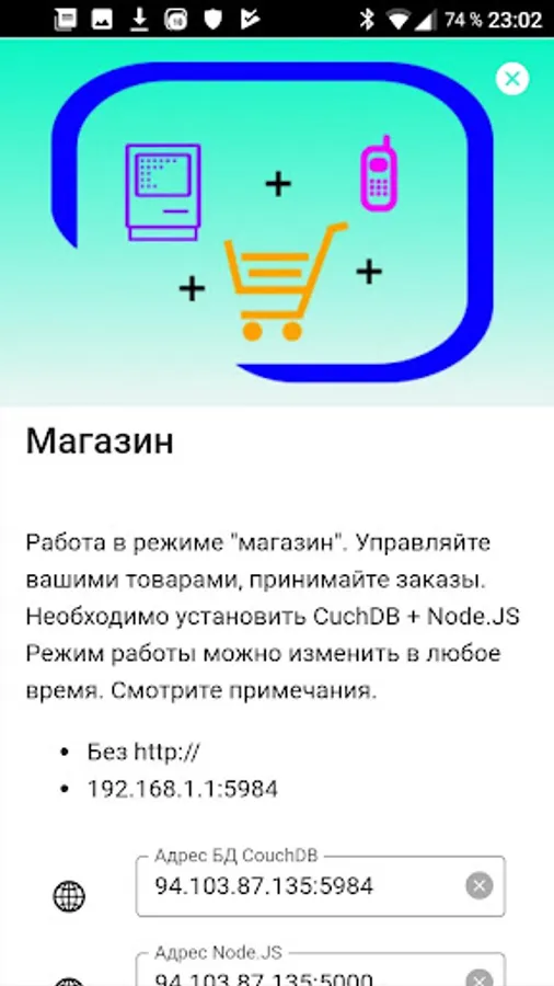 3) Shop mode. In this mode, you can deploy a personal service, such as an online store. To work you need to install additional components on a PC or VPS. See instruction in app or site.