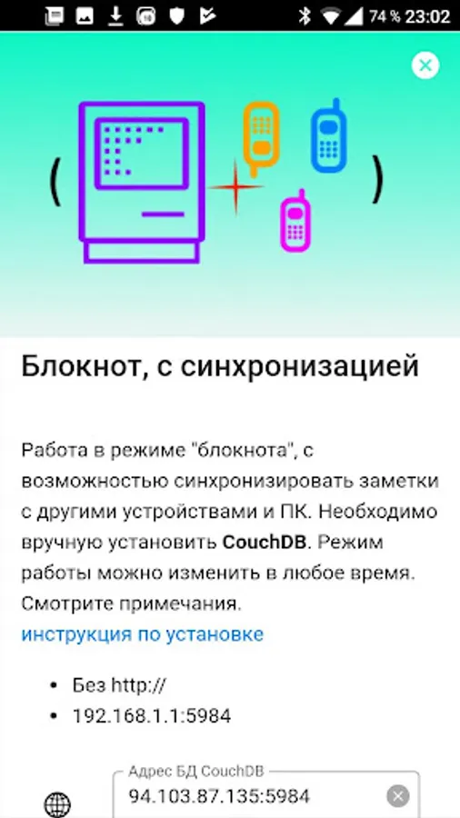 2) Personal with synchronization. In this mode, your phone (this app) can synchronize data with your PC and other phones . To do this, you need to install the database - Couchdb. There is also an analogue of the application under Windows.