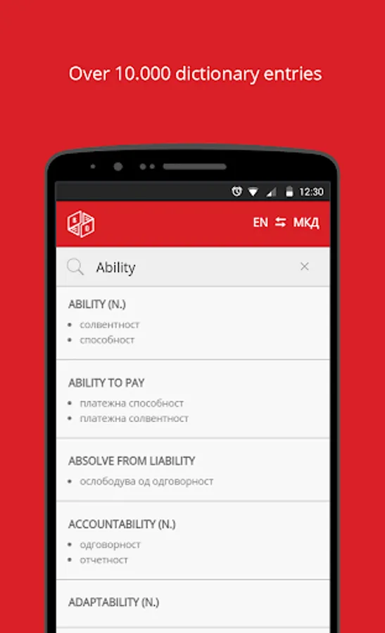 This bilingual dictionary (English-Macedonian, Macedonian-English) is the first translating aid in the form of a mobile application, designed and optimized for your mobile device (works on Android OS). Its easy-to-use interface, functionality, and visually-appealing nature make it an invaluable and practical tool not only for translators but also for students and any person involved in the business sphere.