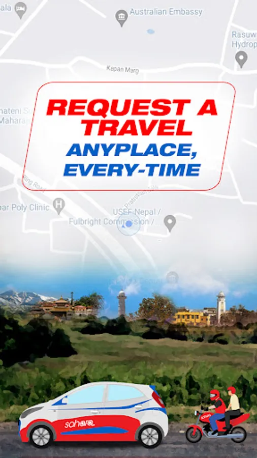 Sahara is a ride-sharing app for fast, reliable rides in minutes—day or night. Don't Worry about Congested roads? Inconvenient public vehicles? Overpriced taxi services? Just Sahara& Go! There’s no need to park or wait for a taxi or bus. With Sahara, you just tap to request a ride, and it’s easy to pay with cash in hand in Kathmandu, Nepal.