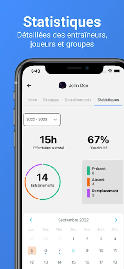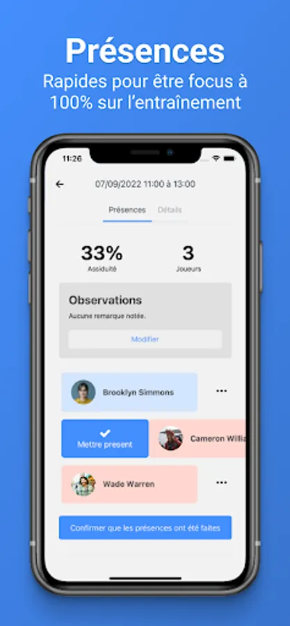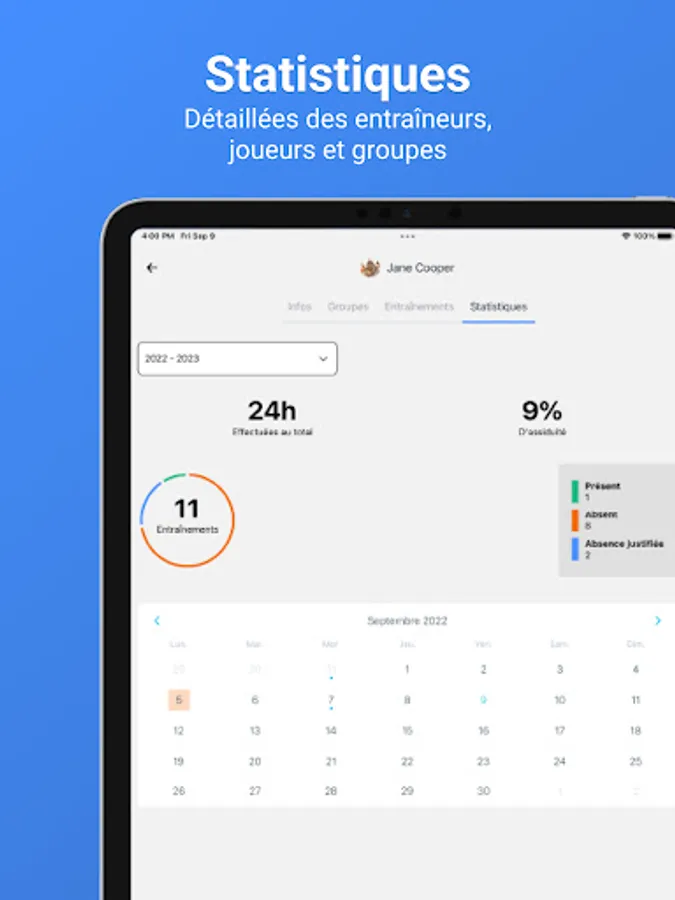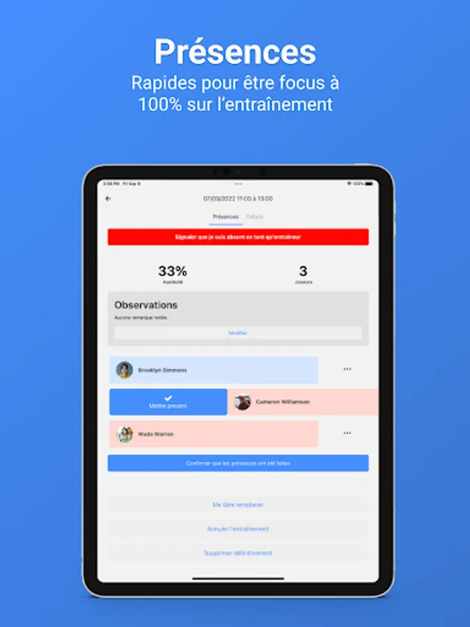 Trainity makes it easy for you to take attendance of coaches and players at your club's training sessions thanks to its simple and intuitive attendance sheet system. Thus, by adding your club's groups to Trainity, you will be able to plan all its training sessions to make attendance quickly, but also be able to keep an eye on it.