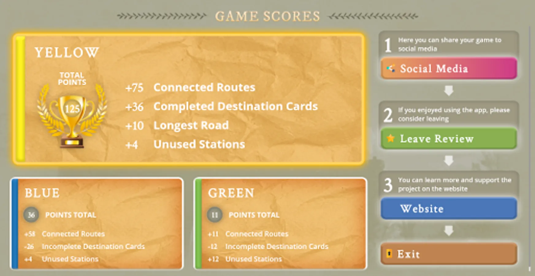 With this app you can simply take a picture of the game board using your phone's camera and it will automatically recognize player trains and calculate the scores for you!