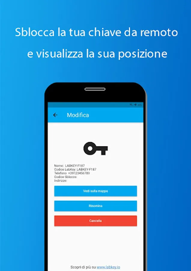 Use your phone number and the code assigned to you to register the LabKey, unlock it remotely with or without double authentication, view its position on the map.