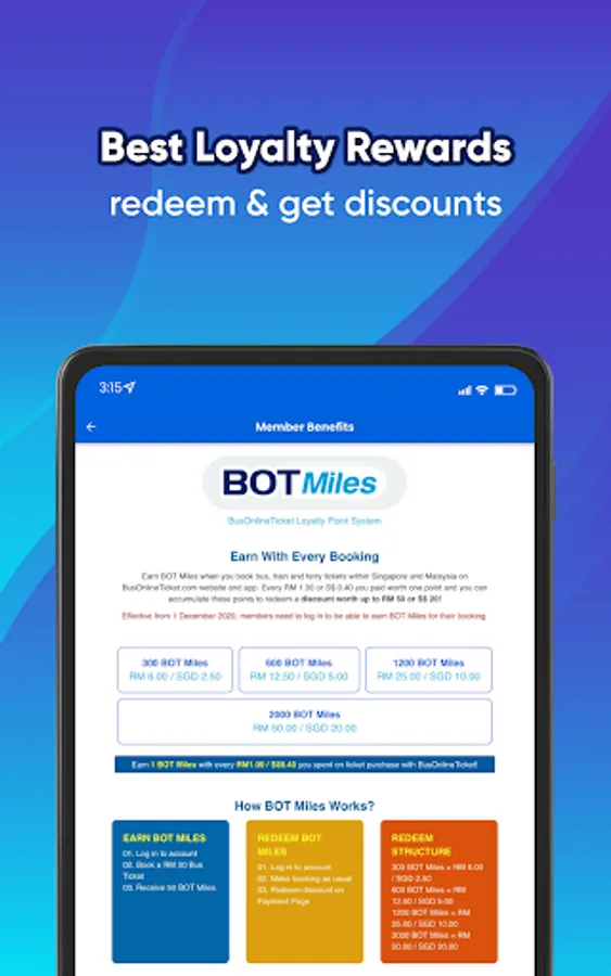 With every booking with BusOnlineTicket.com, members get to earn BOT Miles and redeem up to RM50 / SGD20 discount on their future booking. On top of that, members get to enjoy various member exclusive discounts.