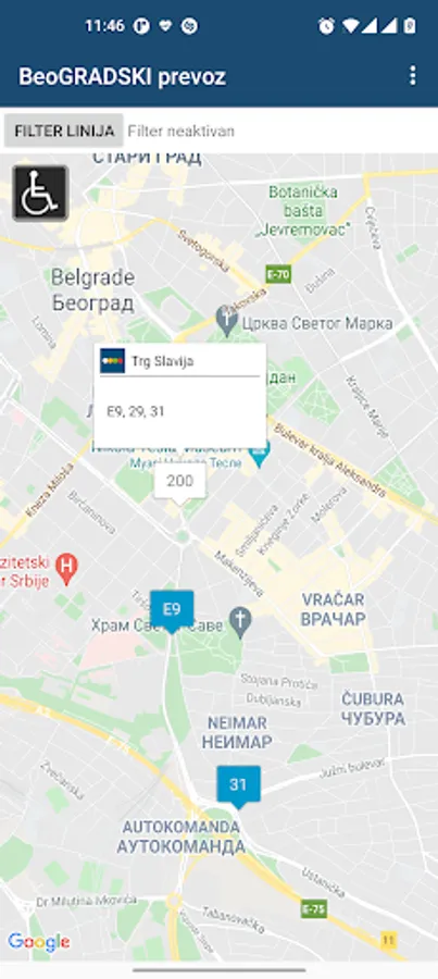 Odabirom ikonice u gornjem levom uglu mape, prikazuju se samo vozila koja sadrže funkcionalnu rampu za pristup invalidskih kolica. Takođe, odabirom nekog od prikazanih vozila na mapi otvara se balončić sa opisom tipa vozila (npr. autobus, zglobni autobus, trolejbus...), nazivom linije na kojoj vozilo saobraća i ikonicom koja ukazuje da li je vozilo opremljeno rampom ili ne.