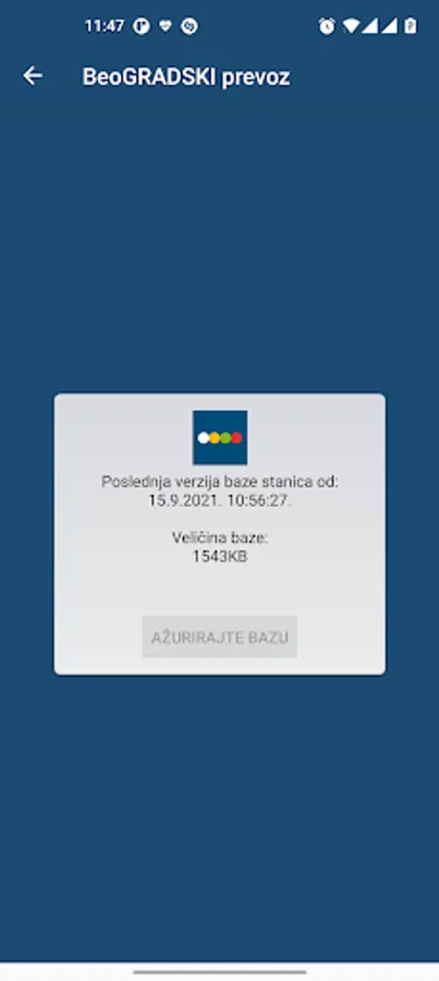 • omogućeno manuelno ažuriranje baze stajališta preko sistemskog menija, pri čemu se prikazuje poslednja ažurirana verzija baze stajališta i njena veličina, uz obaveštenje o novoj verziji, za čije ažuriranje je neophodan pristanak korisnika zbog prenosa podataka;