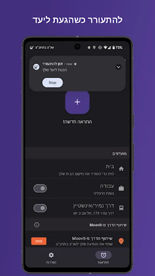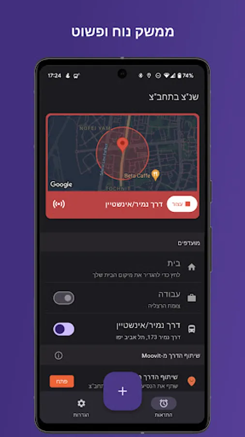 Now it's possible with שנצ בתחבצ - a location based alarm clock! Define the stations where you want to get off or share them from Moovit - and שנצ בתחבצ will do the rest, so you can rest.