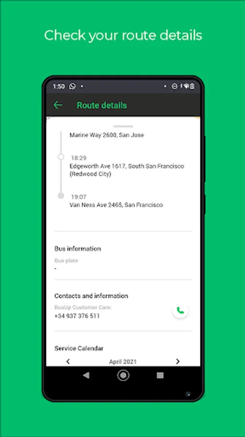 - Quick access to all route details: map, stops, schedules, service calendar, vehicle and driver information, and BusUp customer service contact details.