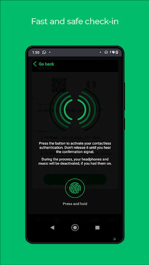 - Easy and safe check-in on board with your QR code or with the latest ultrasound technology (LISNR™), which will allow you to keep a safe distance of at least 50 cm between your phone and the driver's app.