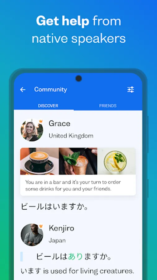 Get feedback on how the language youโre learning is really used in daily life so you can speak like a local. Connect with and learn alongside our online community sharing their knowledge. Feel supported and watch your confidence grow.