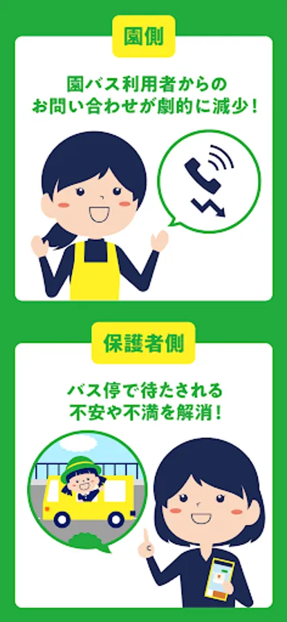 朝や夕方の忙しい時間帯でも、保護者が自分で、好きなタイミングで、バスの位置情報を確認できるからこそ、園と保護者のそれぞれのお悩みを解決することができます。